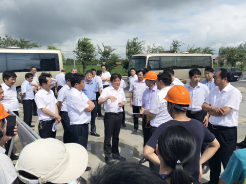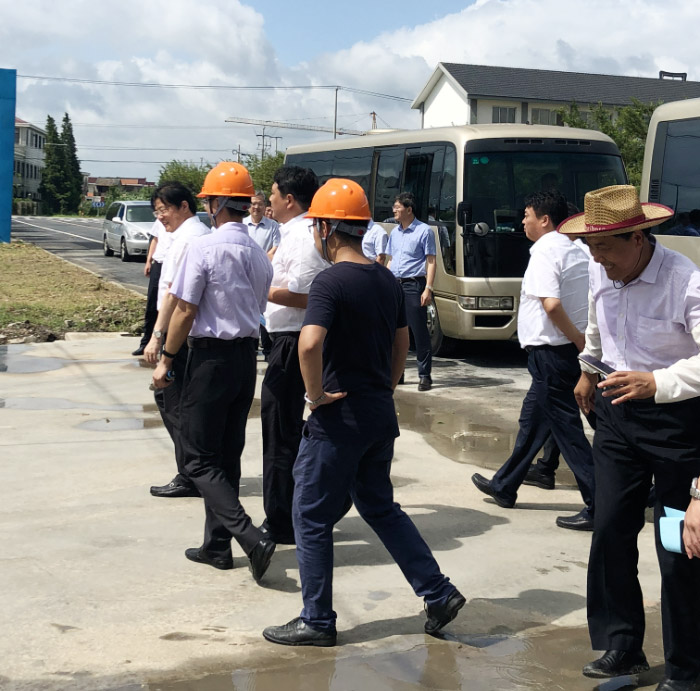 2018年8月3日下午,南通市海安市委书记顾国标、市长于立中、市人大常委会主任周宗泉,市政府各部门负责人,墩头镇政府主要负责人等莅临我司生产基地(江苏江山红化纤有限责任公司)参观指导,我司黄荣庆副总经理热情接待顾书记一行。黄总首先向顾书记详细介绍了公司整体规划以及目前公司项目建设情况;接着黄总向顾书记汇报项目投产后的生产目标:一期工程石墨烯尼龙6切片日产约10吨,正式投产后年产约3000吨,二期工程石墨烯尼龙6切片日产65吨,总年产预计达到2.5万吨。顾书记高度评价了我司石墨烯原位聚合尼龙6生产项目,希望我们克服高温天气给施工带来的困难,保证施工质量,狠抓施工安全,尽快投产,尽早实现效益,同时要求市委市政府各部门、墩头镇政府协调解决海安生产基地建设过程中遇到的问题,为企业做好服务工作,让江山红化纤有限责任公司成为当地经济发展的一个增长点。
