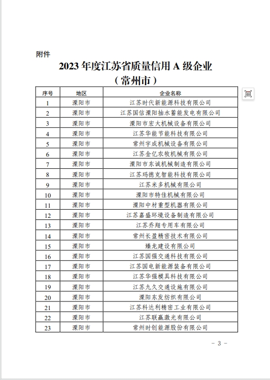 常州市市场监管局关于公布2023年度江苏省质量信用A级企业(常州市)的通知